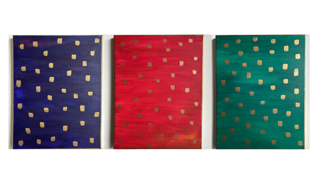 Inspired by some of these beautiful saris, woven from across decades, from different fabrics and handloom traditions of different parts of India, comes this triptych. The colors of the canvases are meant to be as brilliant and full of life as the women who have inspired it, with the gold flecks and borders representing designs, patterns and adornments often found in saris of the subcontinent. I also use gold acrylic generously in my paintings, and naturally gravitated to it for this collection as well.